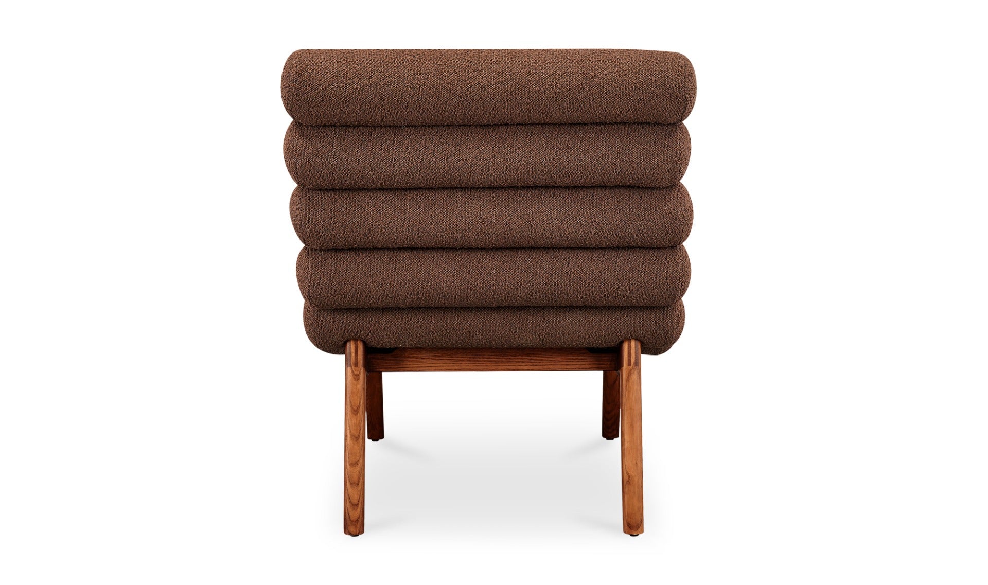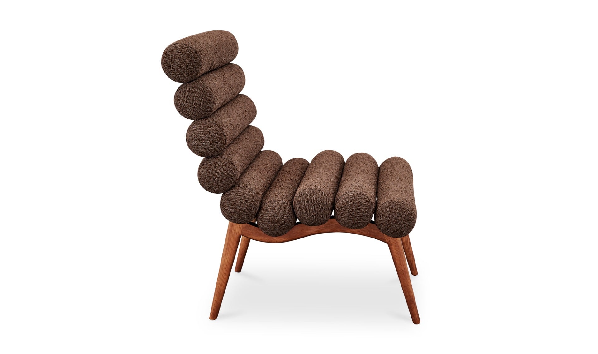 Inspired by the playful forms of the 70s, the Forma accent chair is playful in form and muted in color, with walnut-toned legs giving a nod to mid-century modern. Comprised of a series of 5" diameter tubular forms, the chair's rounded ends provide a point of difference to more common plush channel detailing, while a textured boucle performance fabric finishes off the piece.