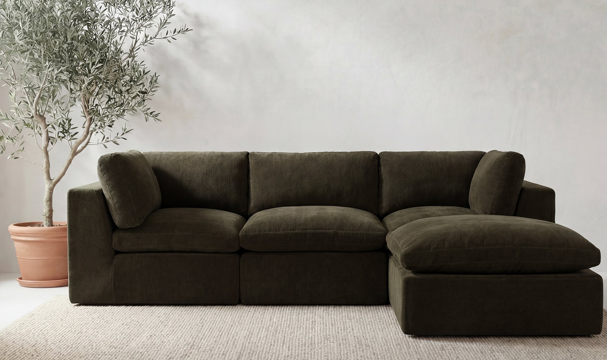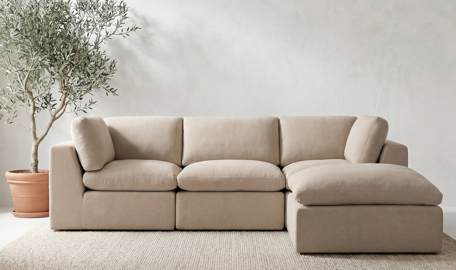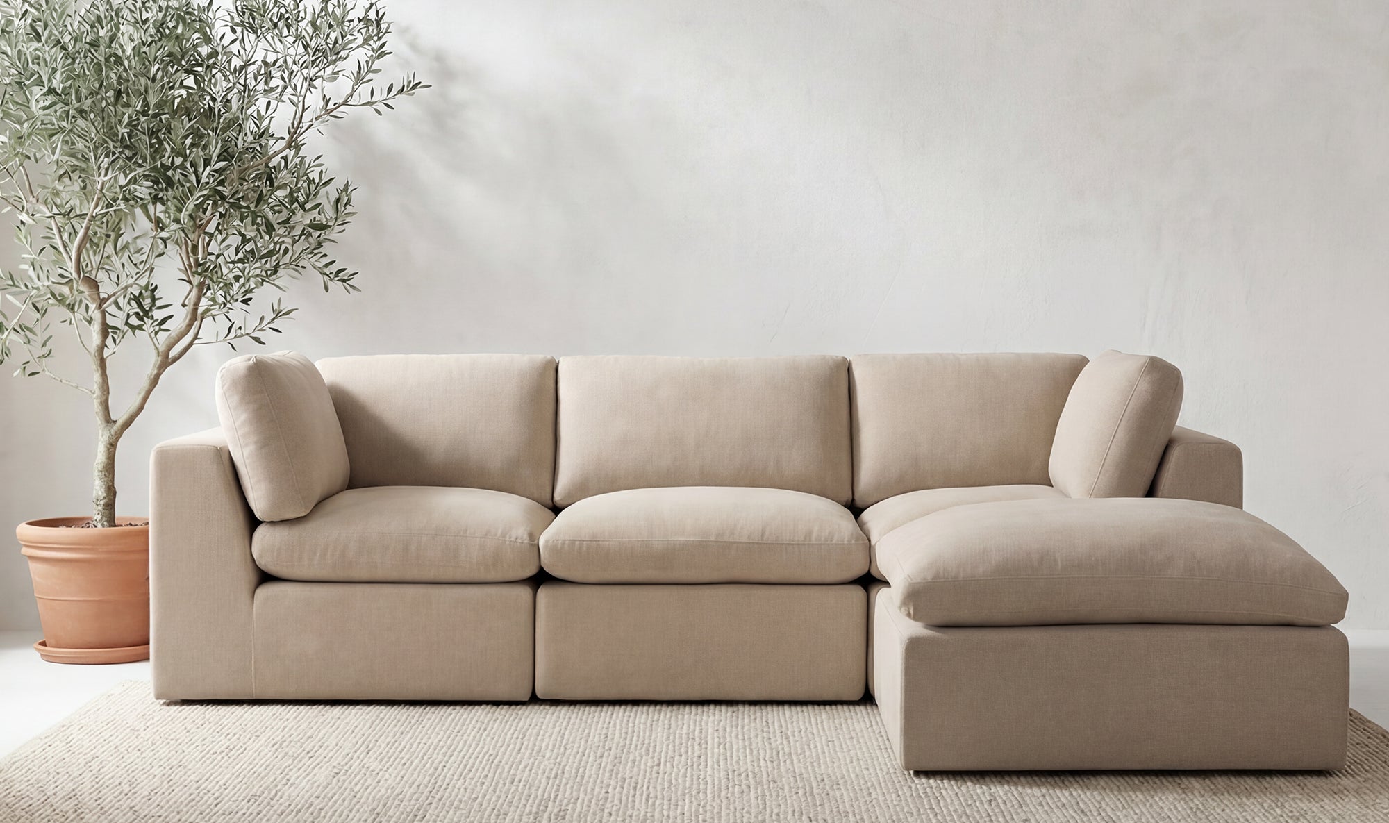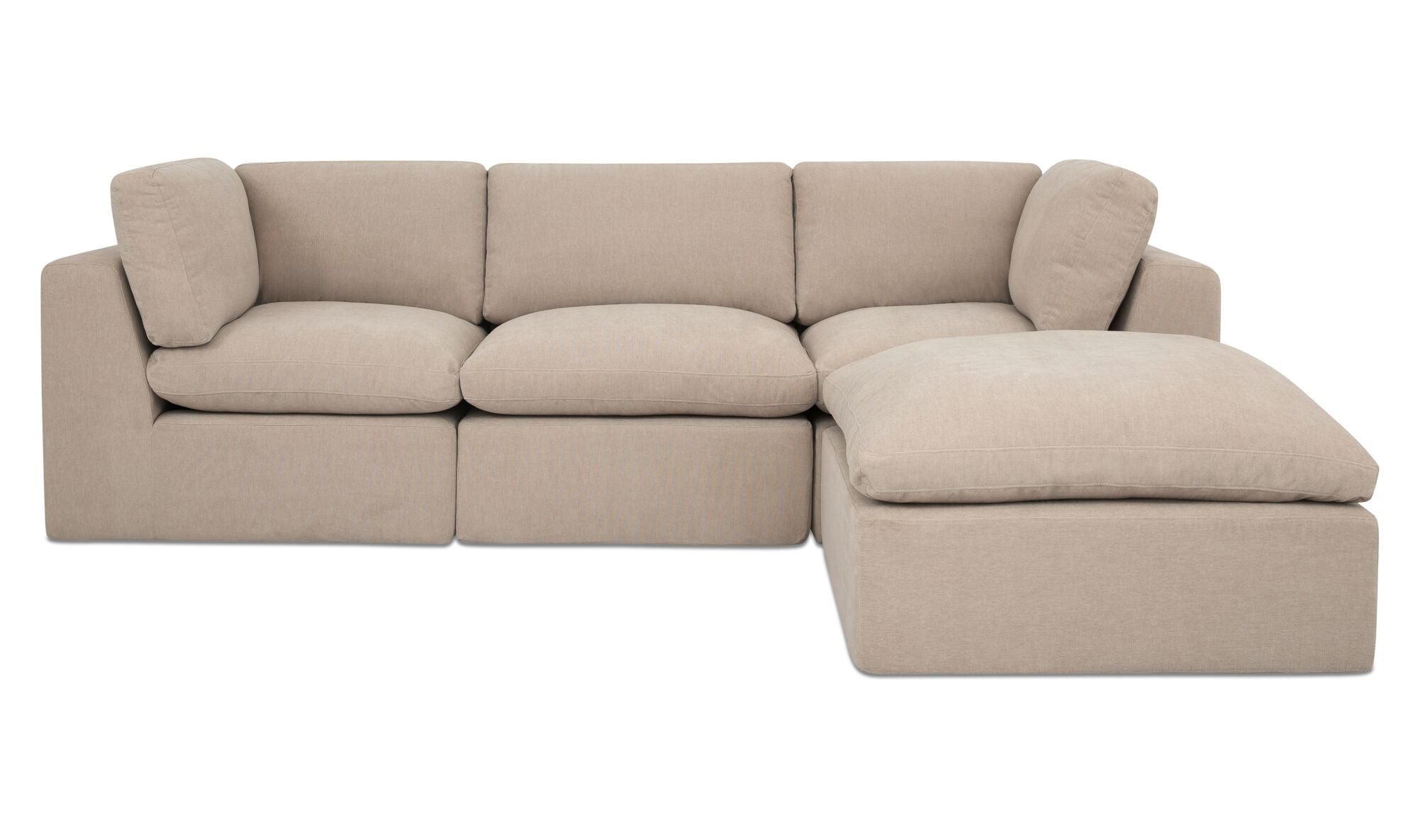 Smart design. Easy comfort. The Flow Modular Sectional delivers sink-in softness with a frameless, foam-based build that feels as good as it looks. Made entirely from dense foam, memory foam, and fiber fill—no frame, no tools—this modular sectional ships vacuum-sealed in space-saving boxes and expands fully within 24 hours. With wide arms, soft back cushions, and a grippy base that stays put, it’s lightweight, low-profile, and endlessly adaptable—perfect for compact living rooms or flexible lounge setups.